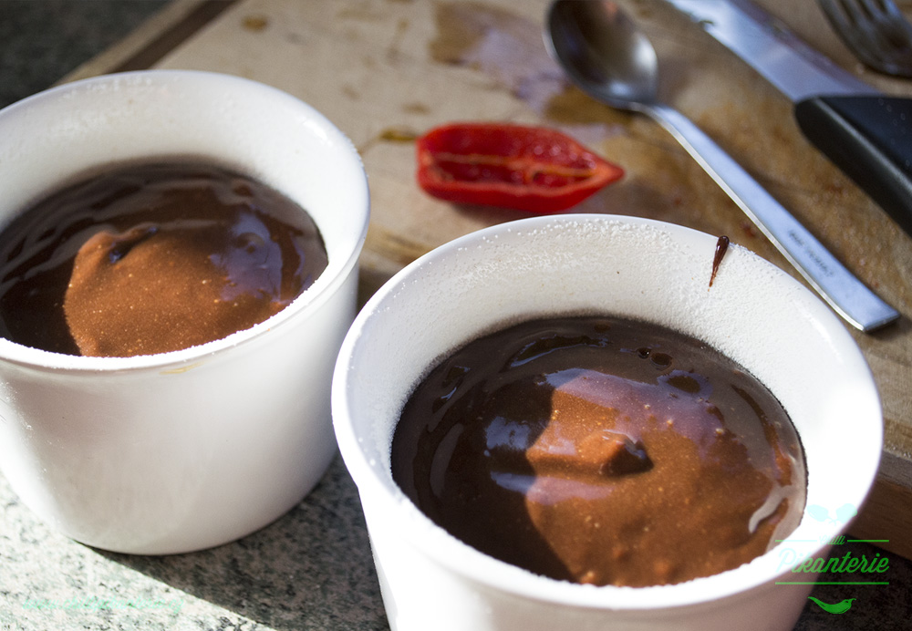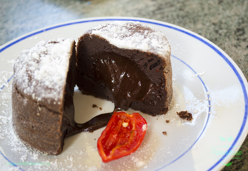 Ve vodní lázni si společně rozpusťte máslo s čokoládou a nechte lehce vychladnout. Mezitím si v míse do pěny ušlehejte třtinový cukr, vejce a na drobno pokrájenou chilli papričku (Habanero nebo Fatalii) k níž následně pomalu přilévejte vlažný čokoládový krém, nakonec ještě přidáme dvě lžíce hladké mouky. Nyní si vymažte dvě kokotky (malé keramické formičky na fondány) máslem, lehce je vysypejte moučkovým cukrem a nalijte do nich připravenou směs (plňte cca do 3/4 formičky). Pečte v předem na 190 stupňů předehřáté troubě přibližně 11 minut (dle dispozic trouby).