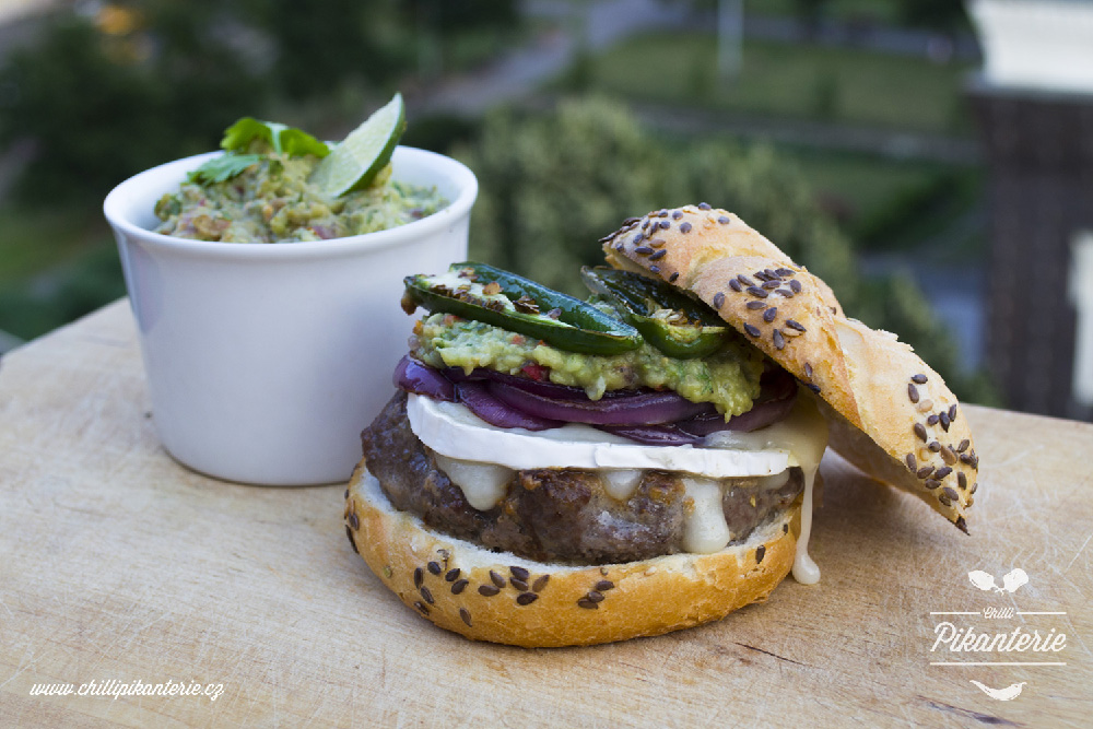 V tento moment si rozehřejeme gril na správnou teplotu a mezitím si připravíme guacamole (viz náš další recept zde), pokrájíme cibuli na kolečka, rozkrojíme housky a sýr opatrně podélně rozporcujeme na 4 kolečka. Poté již grilujeme maso přibližně 3 minuty z každé strany nebo až jeho barva zezlátne aby maso zůstalo středně propečené. Na grilu současně připravíme na půlku rozkrojené papričky Jalapeno, dále do křupava cibulku a lehce osmahneme housky. Poté již poklademe na maso sýr, aby se roztekl, grilovaná kolečka cibule, několik lžic avokádového Guacamole a navrch samozřejmě papričky Jalapeno. Podáváme v zlehka opečené housce. Dobrou chuť.