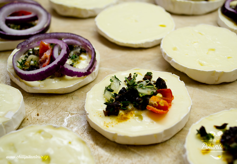 Červenou cibuli si pokrájejte na kolečka a rozdělte na jednotlivé kroužky. Na každý hermelín položte dvě až tři. Čerstvé chilli papričky Habanero omyjte a rozkrojte na čtvrtiny. Do každého hermelínu dejte po dvou kouscích nebo podle vaší chuti. Nyní přišel čas zpátky hermelíny přiklopit vrchní částí.