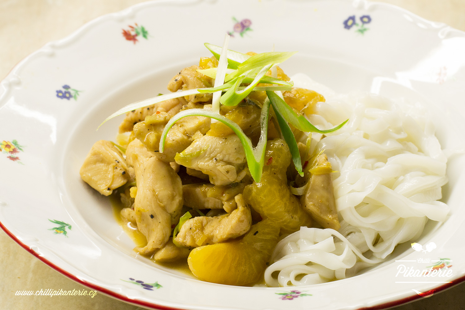 Předpřipravíme si také rýžové nudle podle návodu, většinou je stačí na pár minut zalít horkou vodou a povařit. Nyní rozehřejeme olej v hluboké pánvi a rychle osmahneme kuřecí kostky společně se zázvorem, chilli, cibulkou a česnekem. Následně přilijeme hotovou mandarinkovou šťávu, přivedeme k varu, přihodíme měsíčky mandarinky a necháme přibližně 5 minut podusit.