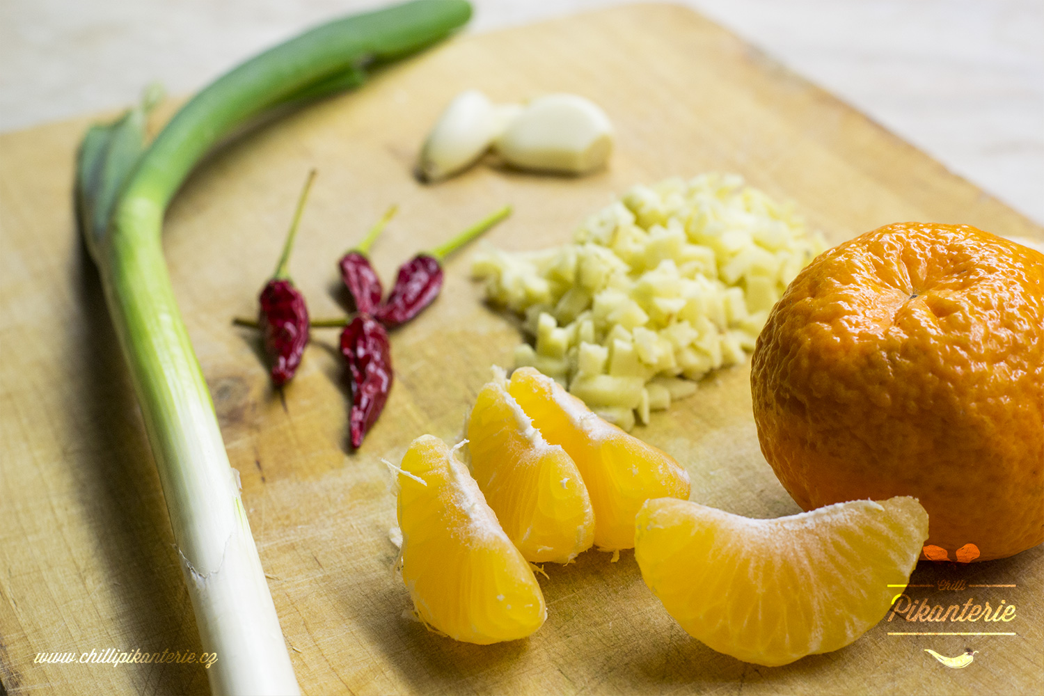 Kuřecí prsa osolíme, opepříme a nakrájíme na kostičky. Ze dvou mandarinek vymačkáme šťávu a smícháme ji s vinným octem, třtinovým cukrem a sójovou omáčkou (necháme odležet). Zbylou mandarinku rozdělíme na měsíčky, česnek, zázvor, cibulku a chilli papričky pokrájíme na kousky.