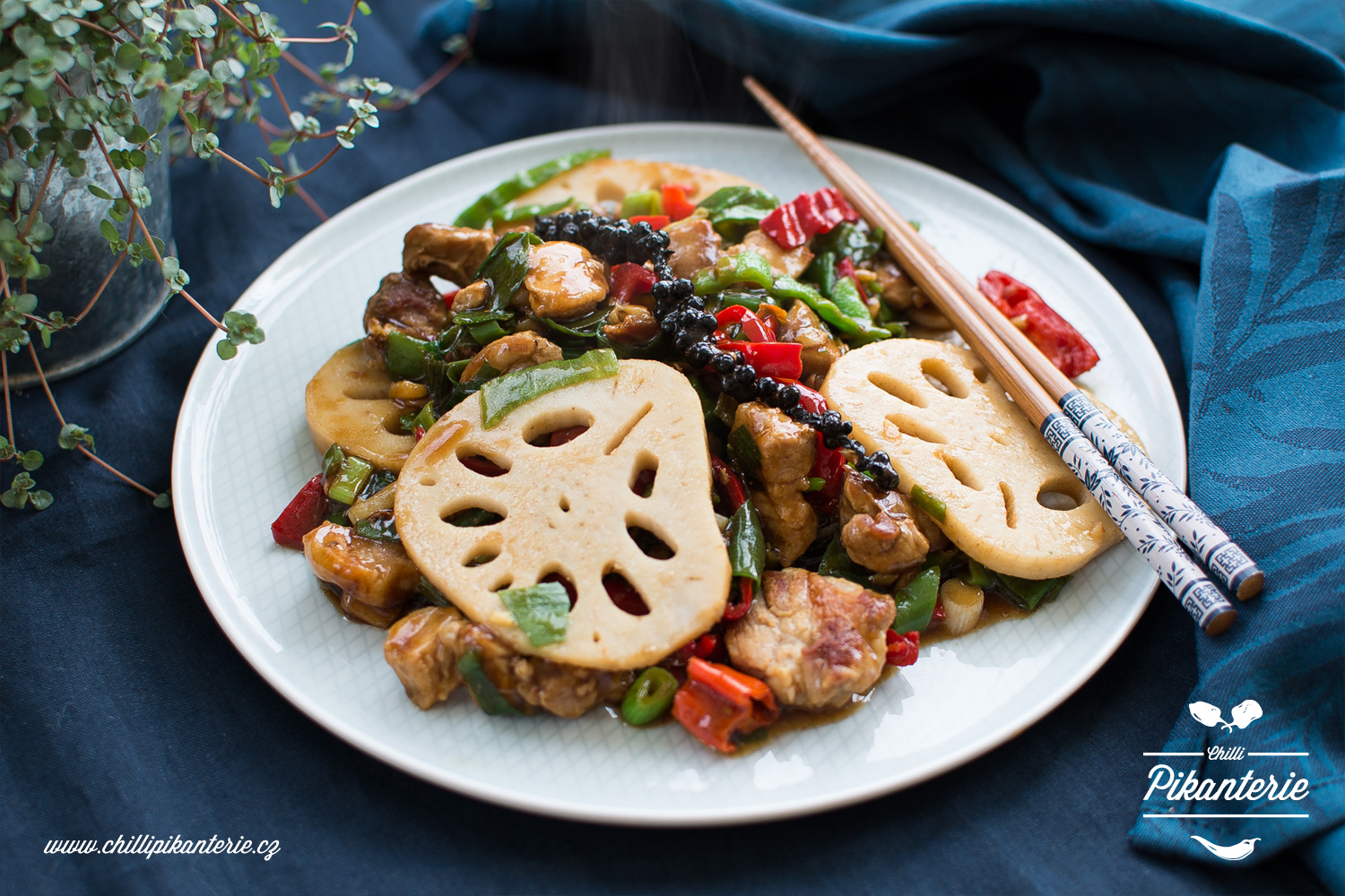 Tentokrát pro vás máme stir-fry s vepřovým masem, lotosovým kořenem a čerstvými chilli papričkami. Recept jsme fotili na podzim, kdy jsme měli po ruce čerstvé papričky ze zahrádky. Použili jsme dvě téměř nepálivé odrůdy, papričku původem z Nikaragui – Criolla de Cocina a japonskou papričku Shishito, kterou jsme použili jak zelenou, tak zralou červenou. Teď v zimě můžete tyto chilli papričky nahradit dostupnými paprikami Ramiro, zelenou paprikou a pro pálivost přidat například čerstvou Thai Red, kterou běžně seženete ve vietnamských večerkách. Další zajímavou ingrediencí v receptu je čerstvý lotosový kořen. Narazili jsme na něj před pár lety v několika asijských receptech a strašně jsme si přáli ho vyzkoušet. A protože kdo hledá, ten najde, tak jsme zjistili, že se dá čerstvý koupit i u nás. Vařený lotosový kořen nám chuťově i texturou připomíná trochu brambory, trochu topinambury. Lotosový kořen se používá na vaření jako zelenina, či na přípravu čaje. V čínské medicíně bývá využíván při nemocech dýchacího ústrojí, virózách nebo jako prevence v chladných měsících. Takže v kombinaci se zázvorem, česnekem a chilli papričkami je tohle jídlo vlastně taková léčivá bomba.