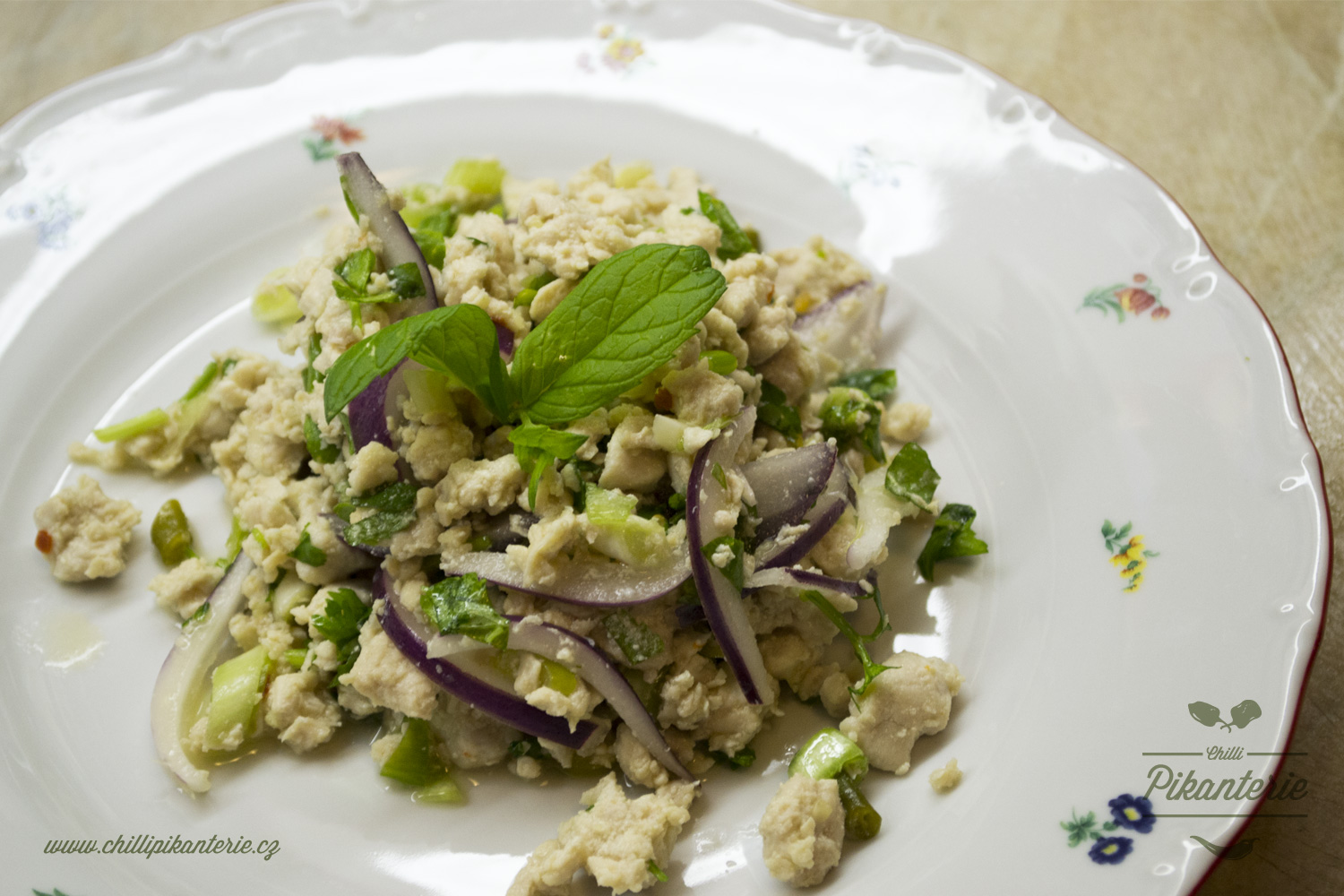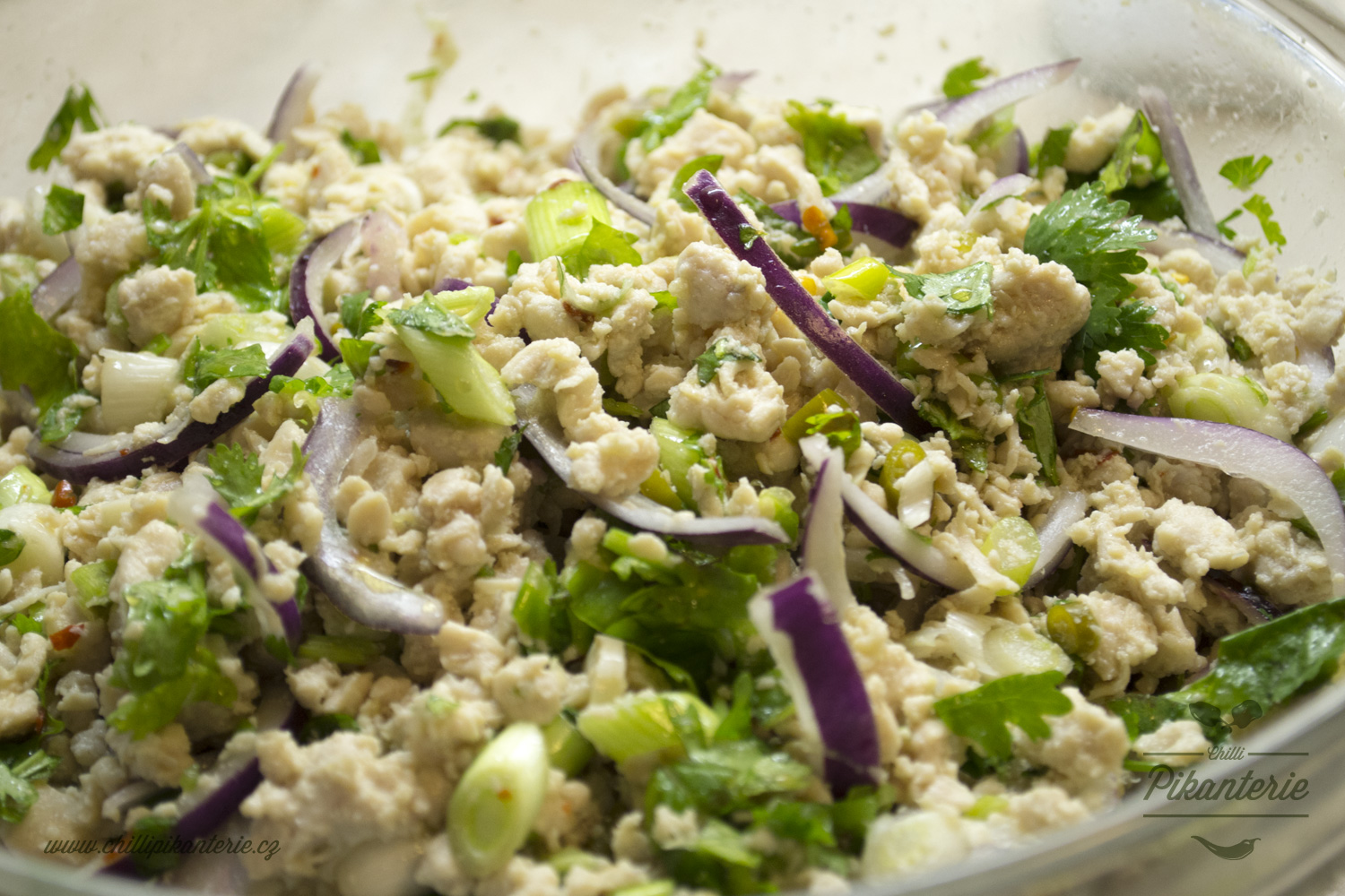 Kuřecí prsa omyjeme, očistíme a nasekáme nožem na drobno. Ve větší pánvi si rozehřejme asi tak dvě lžíce oleje a přidáme nasekané maso. To restujeme do zlatova. Hotové maso nasypeme do mísy. Nyní si připravíme zálivku. Nejprve si chilli papričky nakrájíme na drobno a česnek na plátky. Poté do kastrůlku nalijeme skleničku vody, přidáme lžíci cukru, octa a rybí omáčky a nakrájené chilli a česnek. Řádně promícháme a necháme chvíli povařit. Následně zálivkou zalijeme již připravené maso a rozmícháme. Dále je třeba vymačkat si šťávu ze tří limetek, kterou opět zakápneme maso. Na prkénku si pokrájíme na kolečka červenou cibuli, jarní cibulku a zlehka i koriandr a mátu – toto přidáme k masu a opravdu důkladně promícháme. Na závěr nezapomeneme ochutnat, abychom případně mohli doladit chuť dle individuálních preferencí.