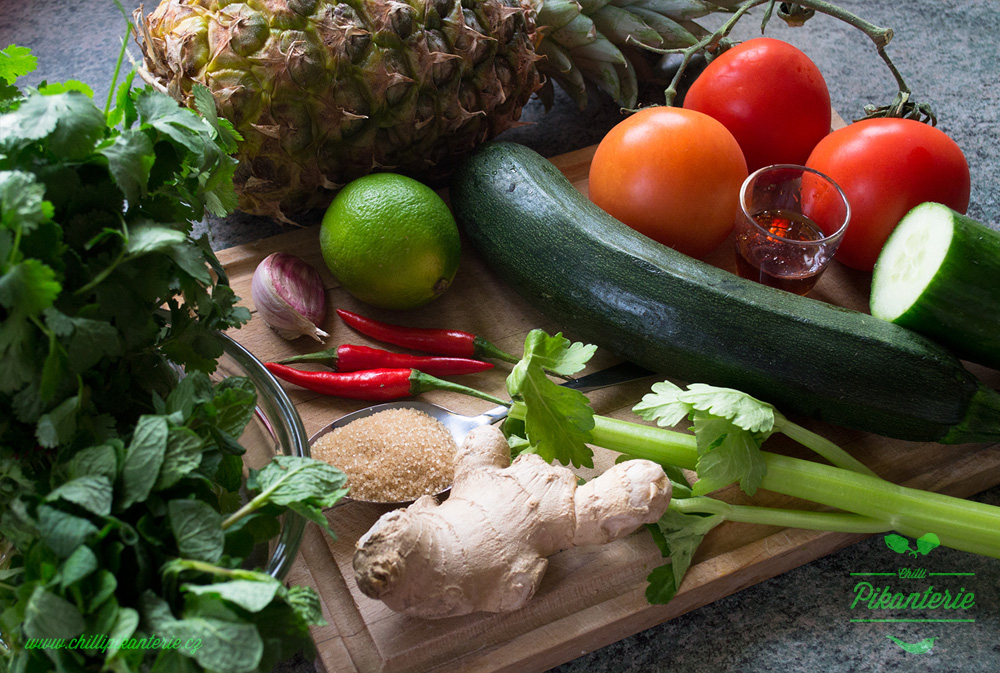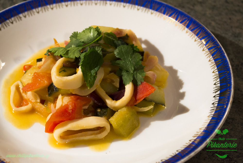 Sépii si pokrájíme na kousky. V hmoždíři si rozdrtíme společně cukr, česnek, chilli papričky – poté do této směsi přidáme rybí omáčku. Ve velké pánvi (nejlépe wok) necháme rozehřát olej na vysokou teplotu a posléze přidáme cibuli, řapíkatý celer a rajčata. Vše opékáme asi minutu. Přimícháme cuketu, okurku, ananas, ananasový džus a důkladně promícháme. Následně přidáme kousky sépie a předem připravenou česnekovou pastu a necháme povařit přibližně 10 minut. Na závěr vlijeme šťávu z 1 limetky a opět pečlivě zamícháme. Necháme ještě chvíli prohřívat a ihned můžeme podávat