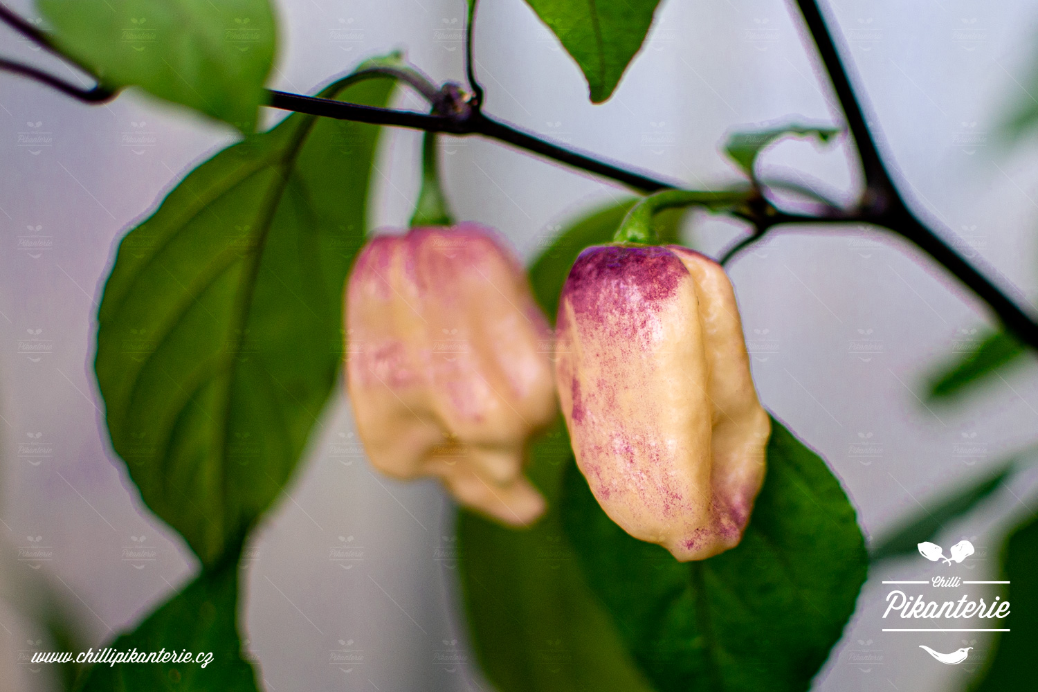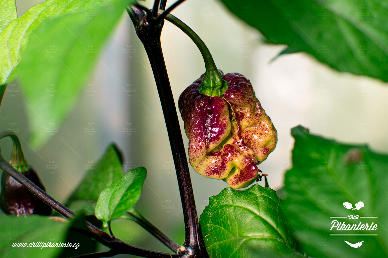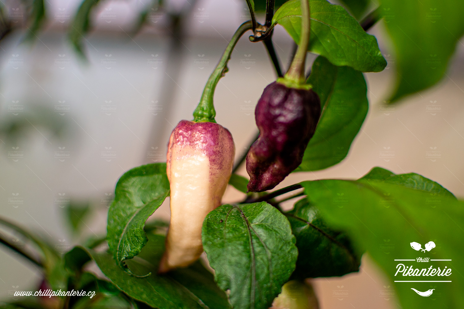 Black Phantom Purple/Peach je fascinující odrůda chilli papričky, která vyniká svou neobvyklou barevnou proměnlivostí a jedinečnou chutí. Rostlina je velmi atraktivní – tmavé stonky a plody přecházejí z tmavě fialové barvy (purple) na jemnou broskvovou (peach), což je nezaměnitelný znak této odrůdy. Díky této vizuální proměnlivosti se stává nejen užitečnou, ale i dekorativní součástí zahrady nebo balkonu. Plody jsou středně velké, štíhlé a dorůstají délky 4 – 7 cm. Chuť je ovocná s mírně kouřovým nádechem, což ji činí perfektní pro čerstvou konzumaci, omáčky nebo sušení.