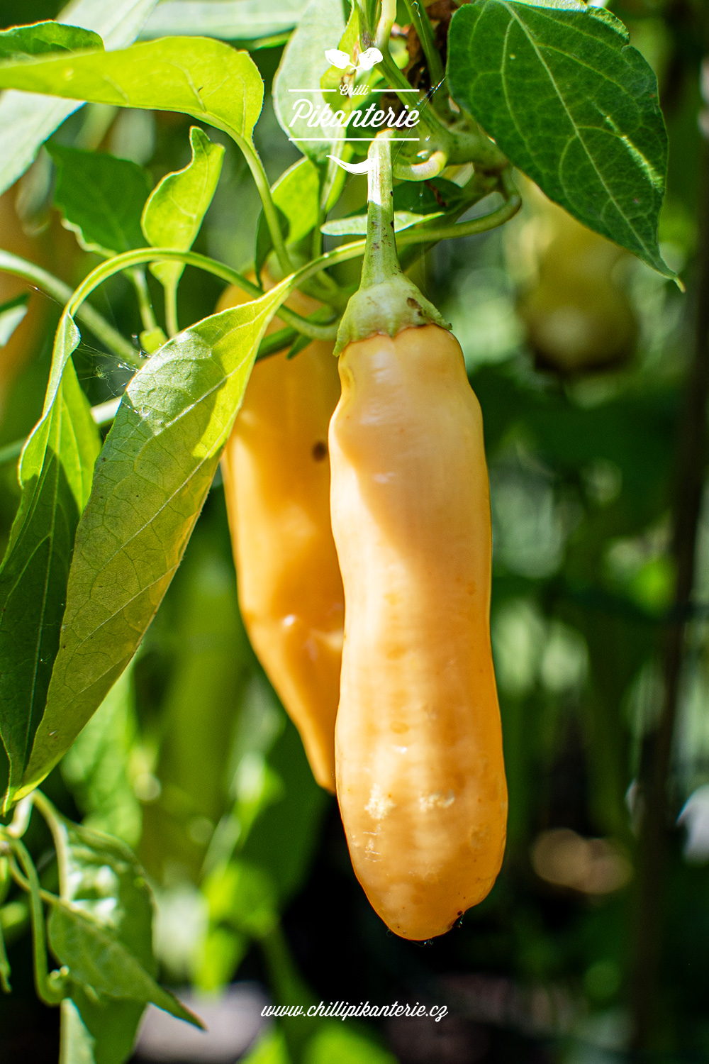 Plody jsou podlouhlé, mírně zvlněné a dorůstají délky 8–12 cm. Zrají od světle zelené barvy až po nádherný broskvový odstín, který zaujme na první pohled. Díky tenké stěně jsou plody vhodné nejen pro čerstvé použití, ale také na sušení, při kterém si zachovávají svou typickou ovocnou vůni i chuť.