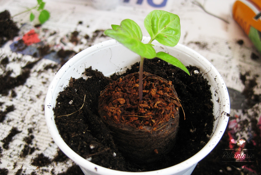 Při prvním přesazení je již vhodné použít malé květináčky, kdy zcela postačí velikost 10 x 10 cm. Nahradit je lze případně klasickými plastovými kelímky o obsahu 3 dcl, které pro svou výšku poskytnou rostlině dostatečný prostor k utvoření kořenového systému a zároveň nezabírají tolik místa. Pro přesazení použijeme klasický substrát typu B či ten na rajčata, zároveň se v tomto okamžiku velmi ocení předchozí výsev do kokosových tablet. Rostlinu totiž vložíme do substrátu i s nabobtnalou tabletou a nemusíme manipulovat s jejími kořínky, které jsou v této fázi velmi křehké a snadno se poškodí. Další variantou jsou čedičové kostky Rockwool nebo rašelinové tablety Jiffy, které umožňují stejně snadné přesazení celého kořenového balu a později se rozpadnou. Rockwool zůstává u kmínku celou dobu, ale zdravé rostliny nemají sebemenší problém a kořeny jím prorostou. Rašelinové Jiffy jsou bohužel velmi náchylné na plíseň a je třeba minipařník velmi dobře větrat, případně ho několikrát za den celý otevřít.