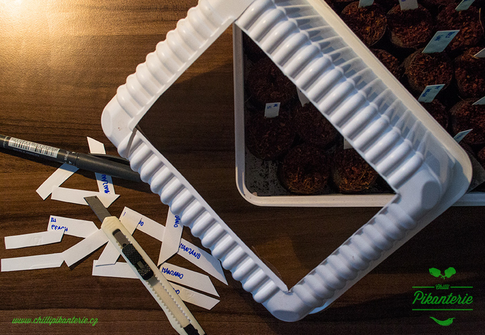 Pokud se vám stane, jako většině pěstitelům chilli papriček, že po pár sezónách se počet vašich rostlinek začíná počítat na desítky či stovky, mohl by se vám hodit tip jak za minimální peníze vytvořit velké množství popisných štítků k rostlinkám. Stačí vám k tomu plastový obal od jakéhokoliv vakuovaného výrobku (maso, klobásy apod.), který byste i tak vyhodili do odpadu. S řezákem je to poté už otázka pár minut a máte rázem velké množství pevných štítků. Stejným způsobem vám například poslouží obyčejné plastové prostírání, které sežene ve většině obchodů a v hobby marketech.